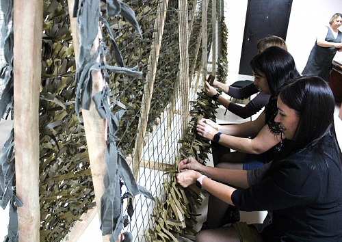 Сети делают из простой рыболовной сетки, куда вплетаются полоски ткани разного цвета. Каждый день сотрудники АО «Теплохим» принимают активное участие в этом непростом деле, вырезают подходящие ленты и надежно вплетают их в определенной геометрии.