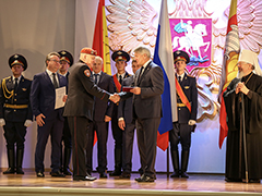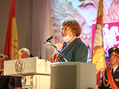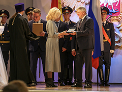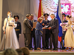 По традиции главным событием церемонии стало чествование Почетных граждан города. В этом году ими стали люди, посвятившие свою жизнь медицине – ветеран Великой Отечественной войны, защитник Воронежа Иван Николаевич Осадчук и врач-пульмонолог, заведующий пульмонологическим отделением Воронежской областной клинической больницы №1 Наталья Эдуардовна Костина. Александр Гусев и Вадим Кстенин вручили Наталье Эдуардовне знаки отличия, подтверждающие присвоение почетного звания (к сожалению, Иван Николаевич, которому этим летом исполнилось 104 года, не смог присутствовать на торжественной церемонии).